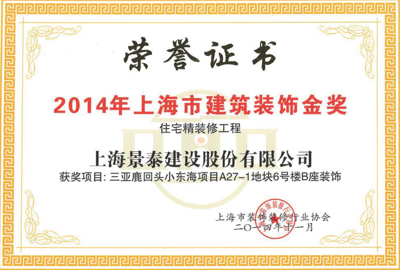 2014年上海市建筑裝飾金獎【住宅精裝工程】 三亞鹿回頭小東海項目A27-1地塊6號樓B座裝飾