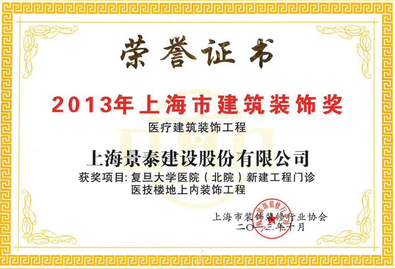 2013年上海市建筑裝飾獎【醫(yī)療建筑裝飾工程】 復(fù)旦大學(xué)醫(yī)院(北院)新建工程門診醫(yī)技樓地上內(nèi)裝飾工程