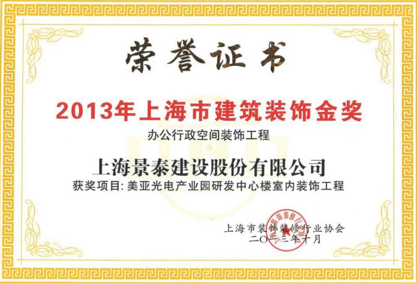 2013年上海市建筑裝飾金獎【辦公行政空間裝飾工程】 美亞光電產(chǎn)業(yè)園研發(fā)中心樓室內(nèi)裝飾工程